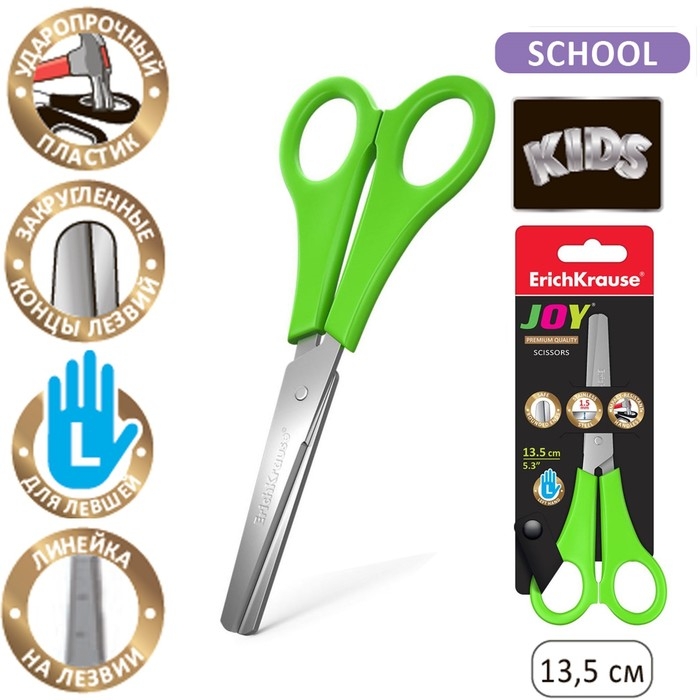 Ножницы детские для левшей 13,5 см, ErichKrause Joy Left Hand, с закруглёнными концами лезвий и линейкой, МИКС