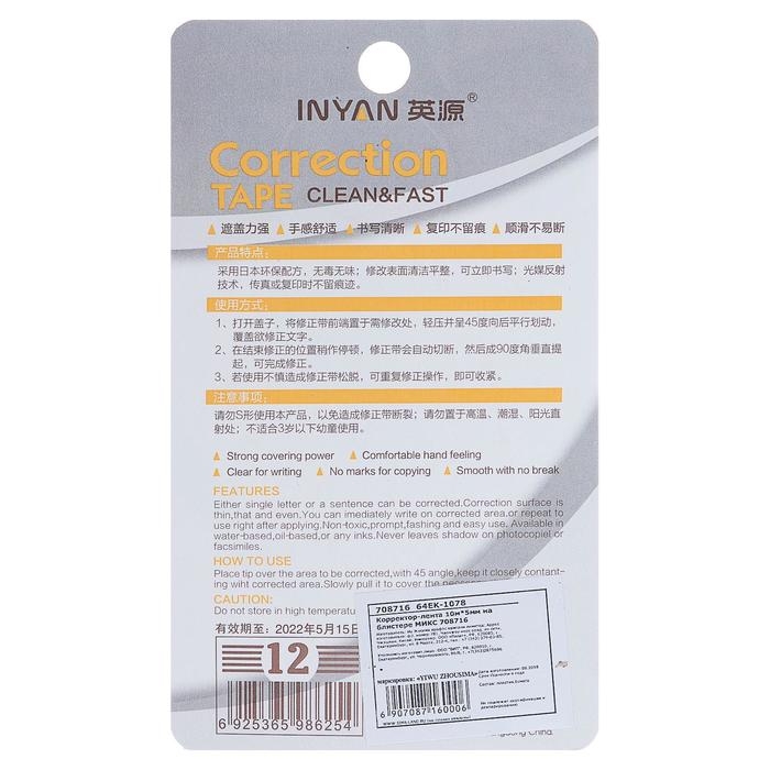 Корректор-лента, 10 м х 5 мм, INYAN, на блистере, МИКС