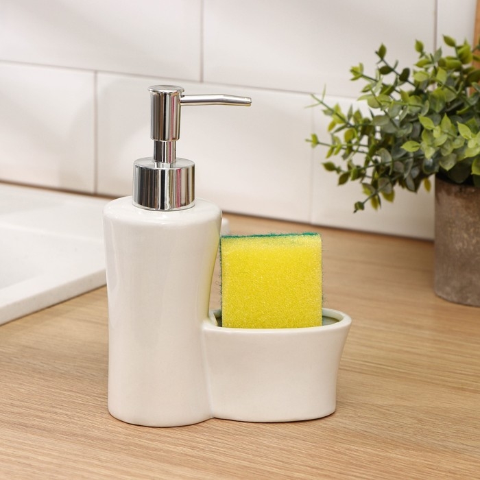 Дозатор для моющего средства с подставкой для губки Доляна, губка в комплекте, 385 мл, цвет белый