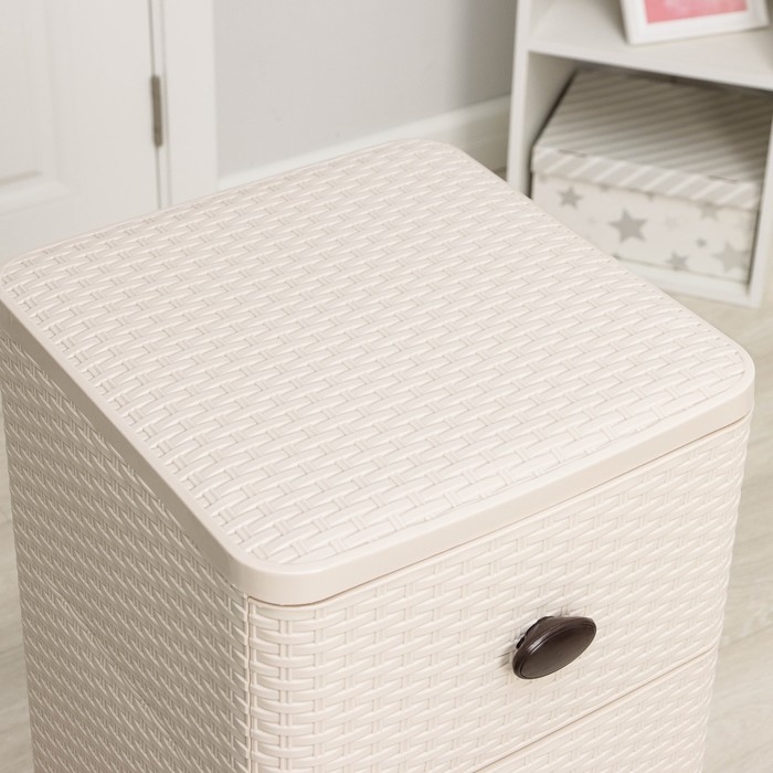 С помощью практичного пластикового комода вы правильно организуете хранение вещей. Изделие имеет жёсткую конструкцию за счёт цельных боковых стенок. Отсутствие острых углов делает его безопасным для ребёнка. Комод изготовлен из экологически чистого материала, не содержит вредных веществ.