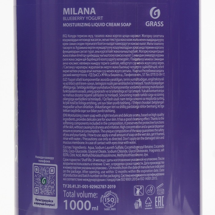 Жидкое крем-мыло Milana черника в йогурте с дозатором 1л