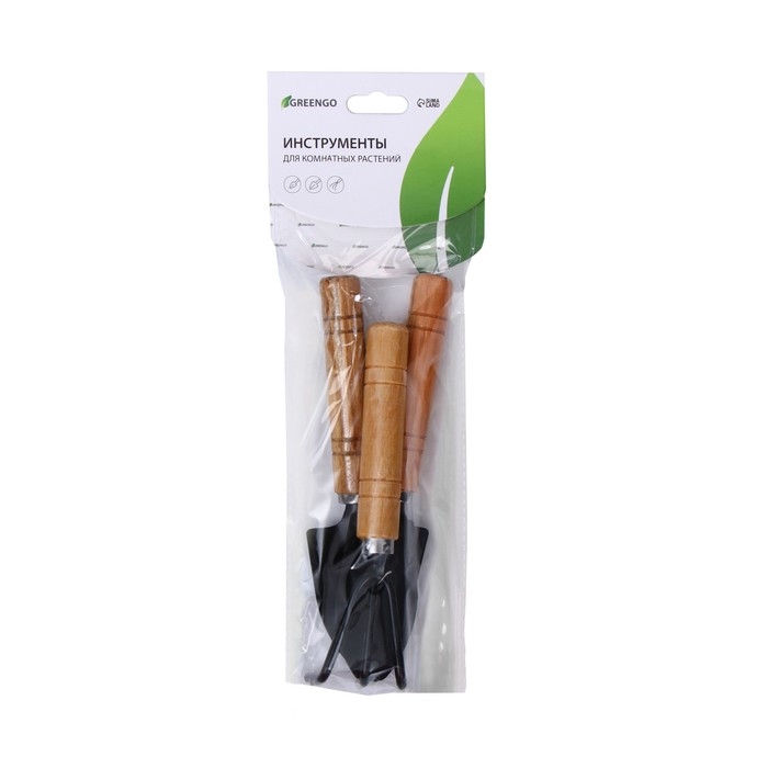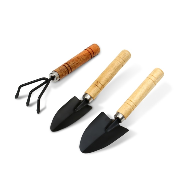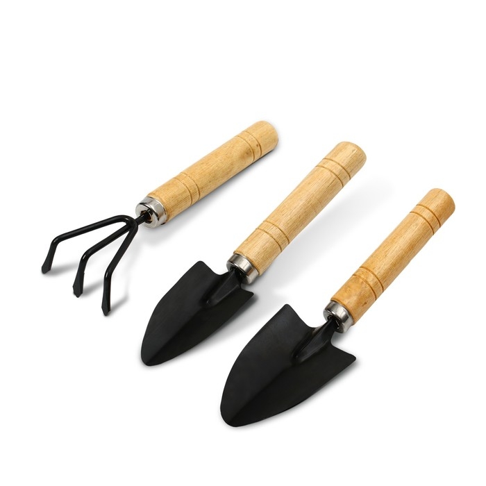 Набор садового инструмента, 3 предмета: грабли, 2 лопатки, длина 24 см, деревянные ручки, Greengo