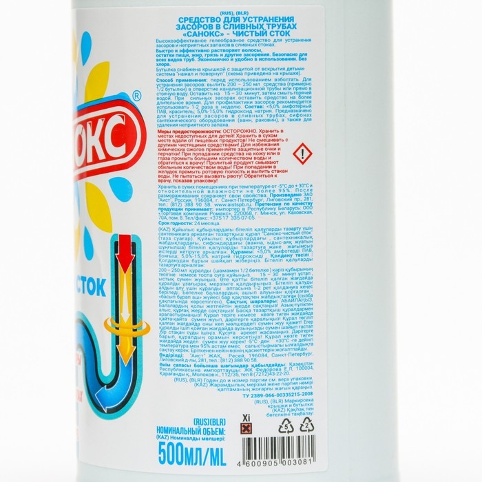 Средство для устранения засоров Санокс «Чистый сток», 500 мл