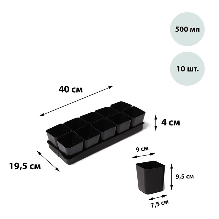 Набор для рассады: стаканы по 1 л (10 шт.), поддон 61 × 23 см, чёрный