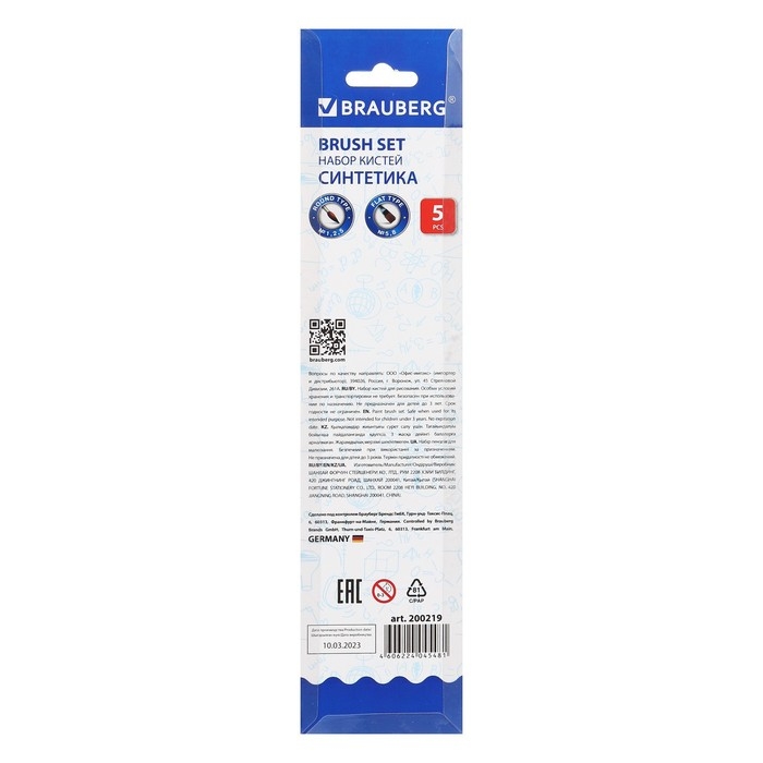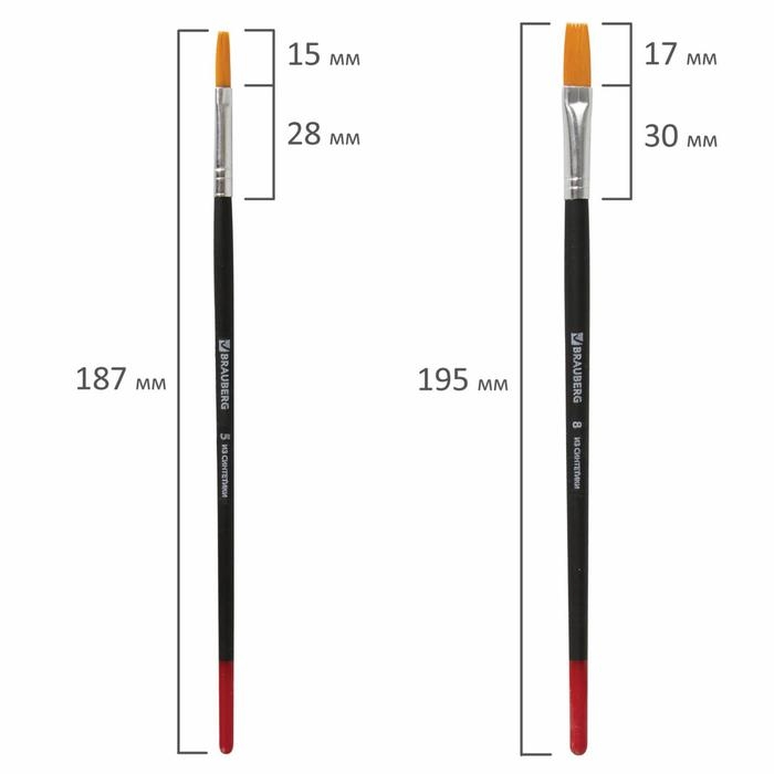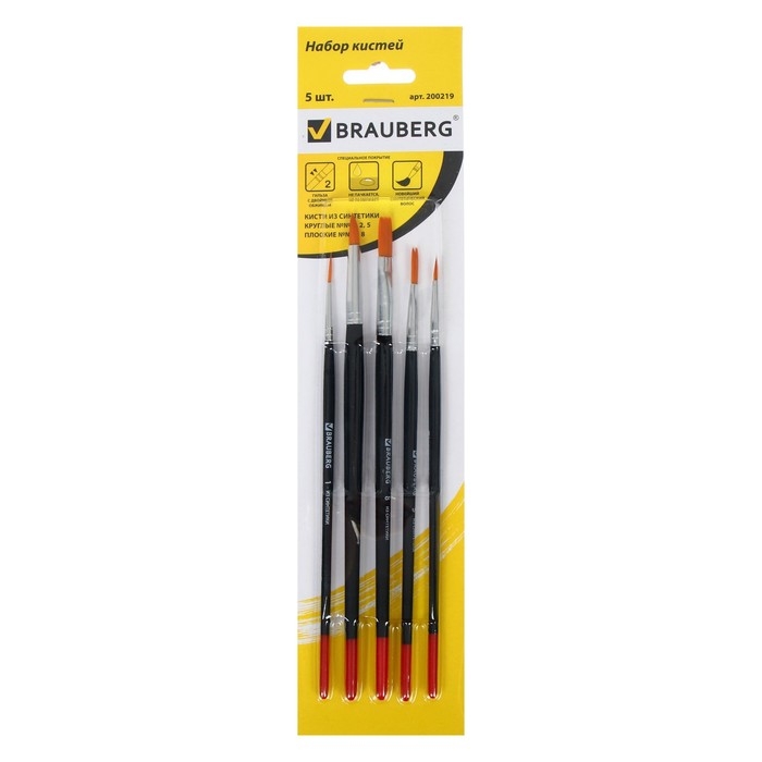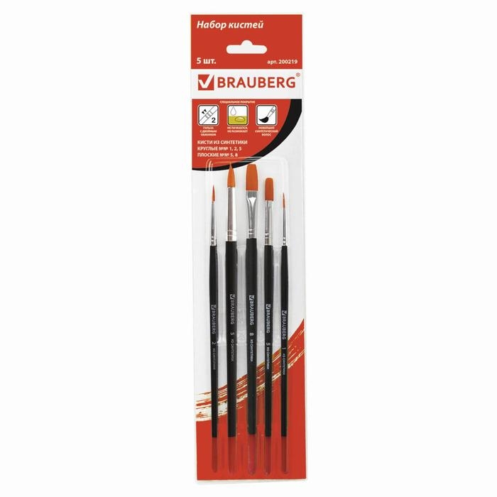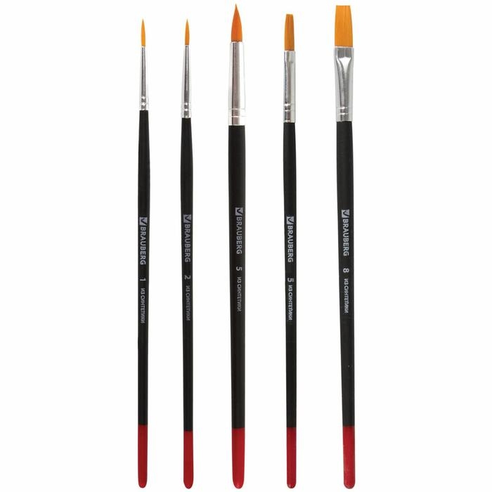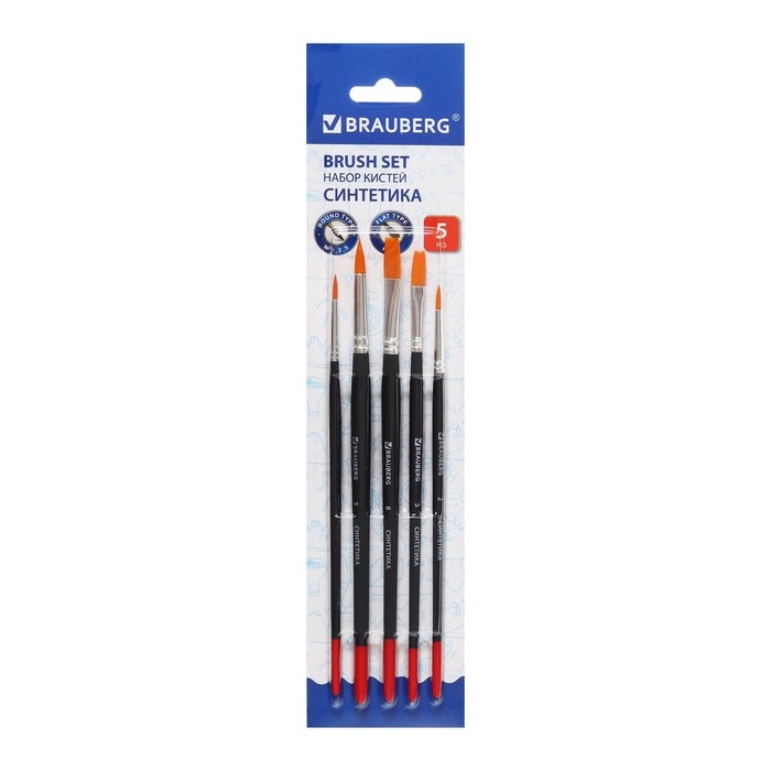 Набор кистей, синтетика, 5 штук, BRAUBERG (круглая, № 1, 2, 5, плоская № 5, 8), блистер
