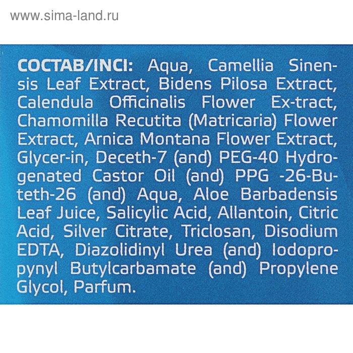 Состав: комплекс экстрактов зелёного чая, череды, календулы, ромашки, арники, гидрогенизированное касторовое масло, гель алоэ вера, салициловая кислота, аллантоин, лимонная кислота, цитрат серебра, триклозан.