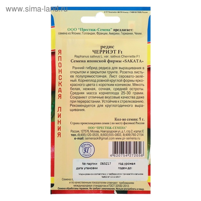 Ранний гибрид редиса для выращивания в открытом и закрытом грунте. Розетка листьев полупрямостоячая. Лист серовато-зелёный. Корнеплод ровной круглой формы ярко-красного цвета с коротким кончиком. Мякоть белая, нежная, сочная, средней остроты. Средняя масса корнеплода 25-30 грамм. Сохраняет отличные вкусовые качества даже при перерастании. Устойчив к стрелкованию. Рекомендуется для круглогодичного выращивания.