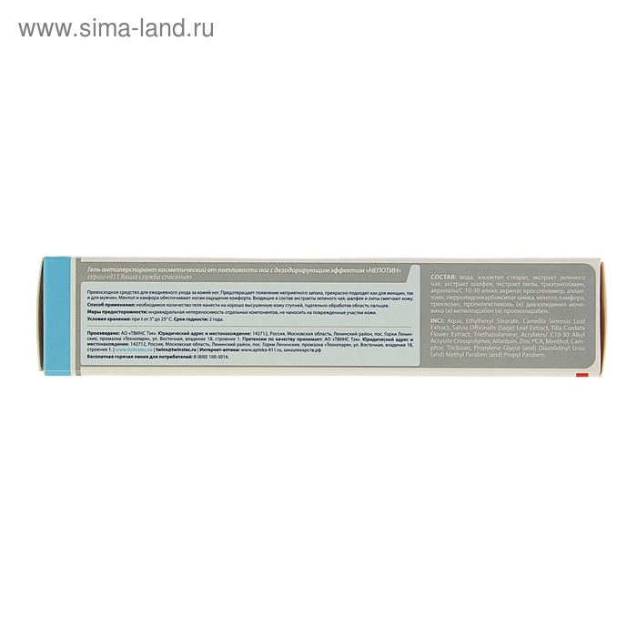 «Непотин 911» препятствует интенсивному потоотделению стоп и предотвращает появление неприятного запаха. Средство содержит триклозан. Благодаря этому оно обладает противовоспалительным, подсушивающим, противогрибковым и антимикробным действием.