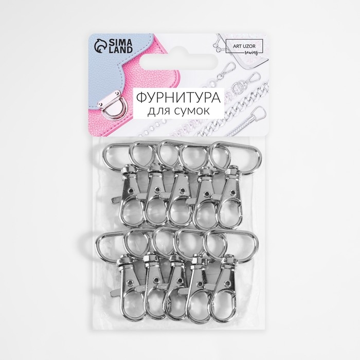Металлический карабин предназначен для крепления ремней, ручек или декоративных элементов к сумке. Изготовлен из прочного металла, имеет гладкую поверхность и элегантный вид, что делает его не только функциональным, но и стильным элементом фурнитуры.
