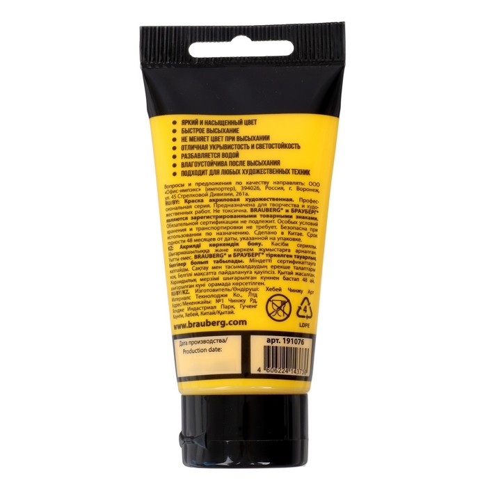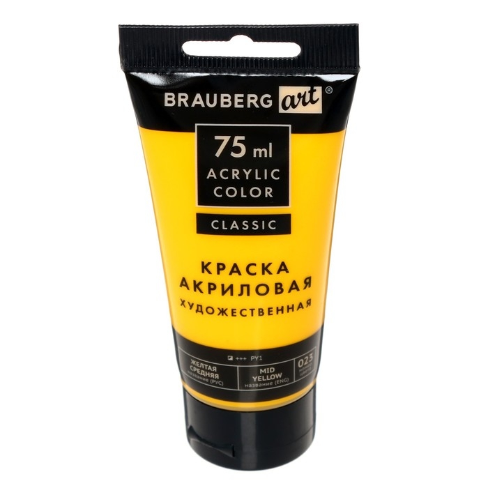 Краска акриловая художественная туба 75 мл, BRAUBERG "Жёлтая средняя"