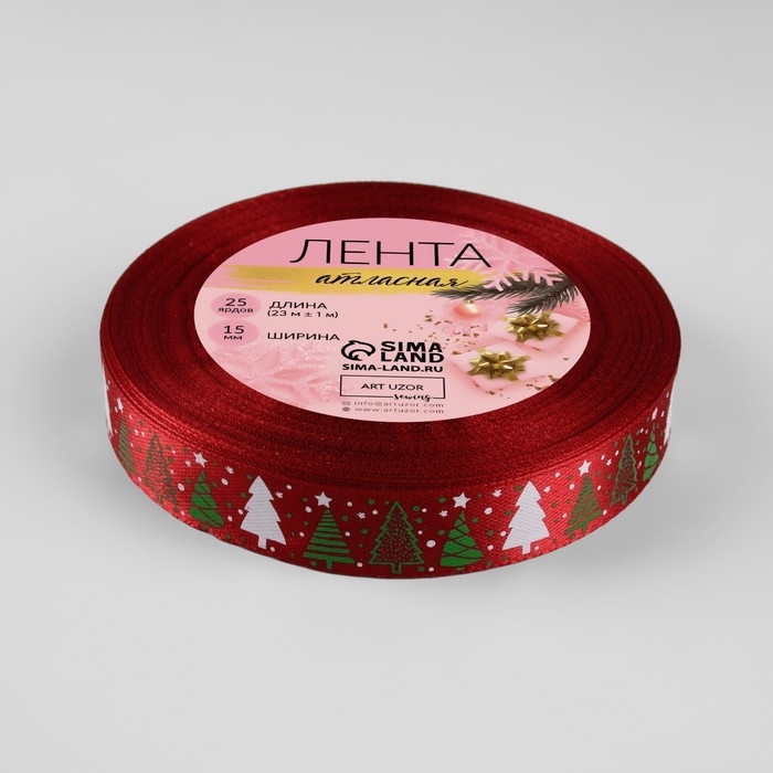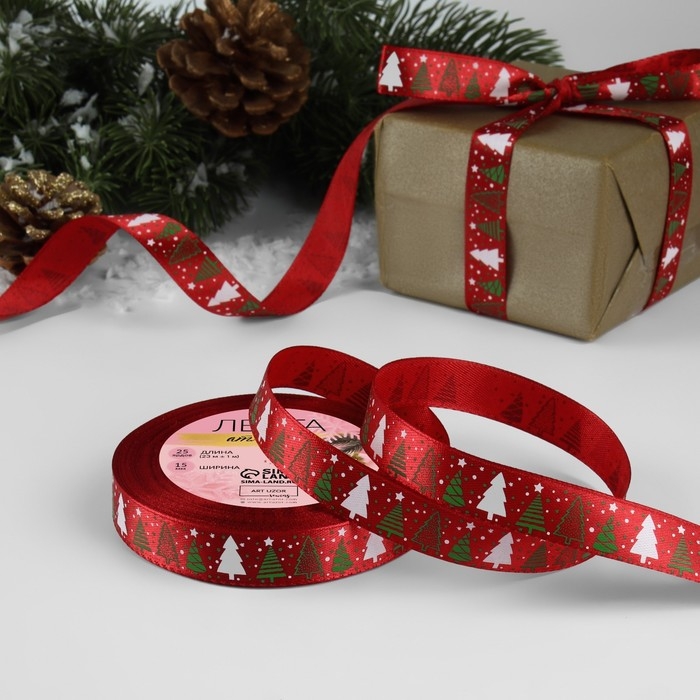 Новый год! Лента атласная «Ёлки», 15 мм, 23 ± 1 м, цвет красный №33