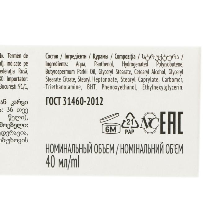 Состав: Aqua, Panthenol, Hydrogenated Polyisobutene, Butyrospermum Parkii Oil, Glyceryl Stearate, Cetearyl Аlcohol, Glyceryl Stearate Citrate, Stearyl Heptanoate, Stearyl Caprylate, Carbomer, Тriethanolamine, BHT, Phenoxyethanol, Ethylhexylglycerin.