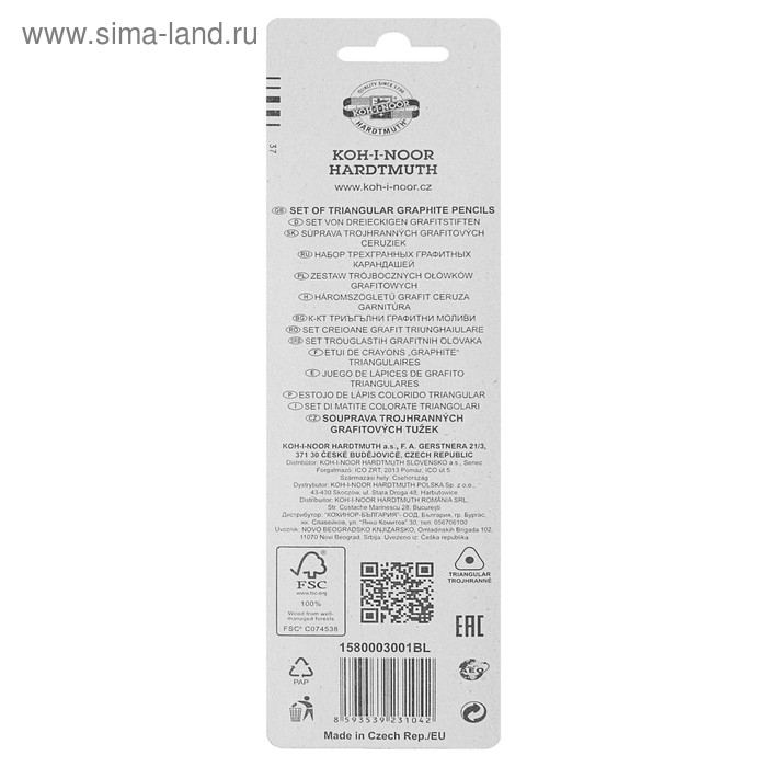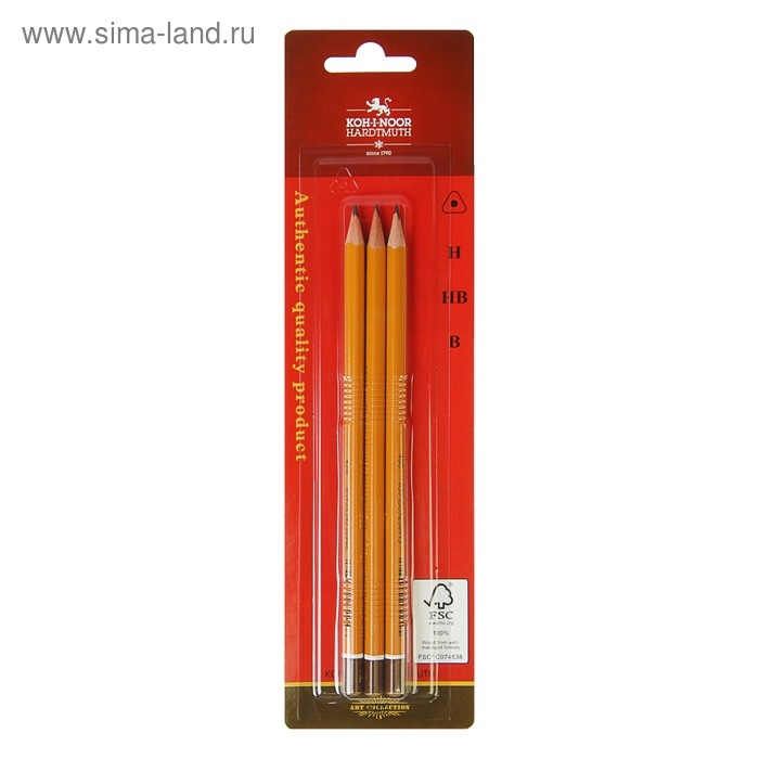 Набор карандашей чернографитных разной твердости 3 штуки Koh-I-Noor 1580 ART, B, H, HB, в блистере