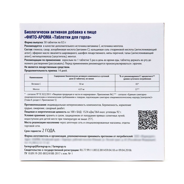 Таблетки «Фито-Арома» для горла, 50 таблеток по 500 мг