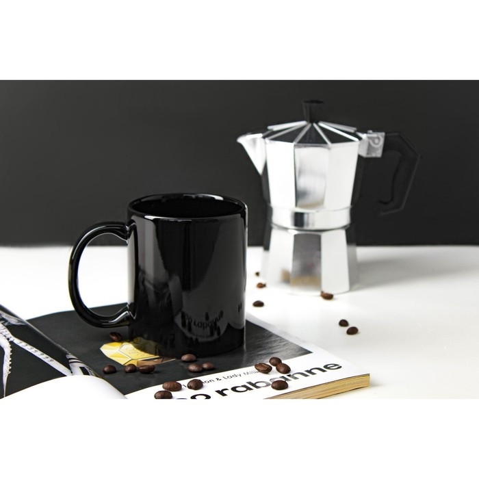 Кружка выполнена из качественной керамики, что обеспечивает её долговечность и устойчивость к сколам. Гладкая текстура и однотонный черный цвет придают изделию строгий и благородный вид, делая его подходящим как для уютных домашних посиделок, так и для деловых встреч.
