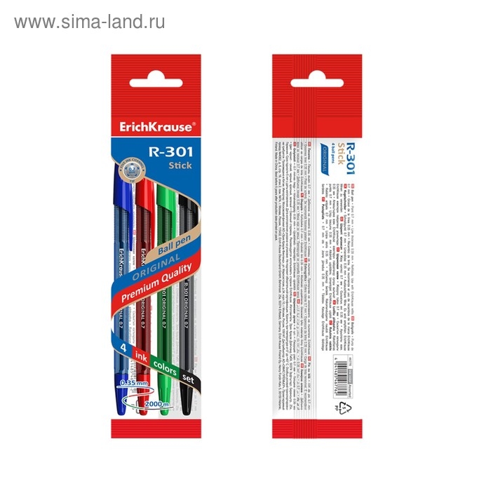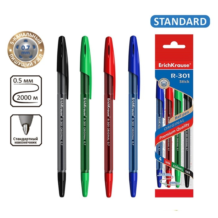 Набор ручек шариковых ErichKrause R-301 Original Stick, 4 штуки, стандартный узел 0,7 мм, чернила микс, корпус тонированный микс