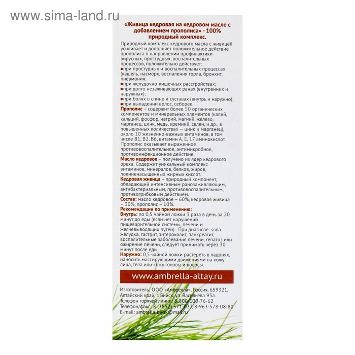 Живица кедровая на кедровом масле с добавлением прополиса» — 100%-ый природный комплекс.
