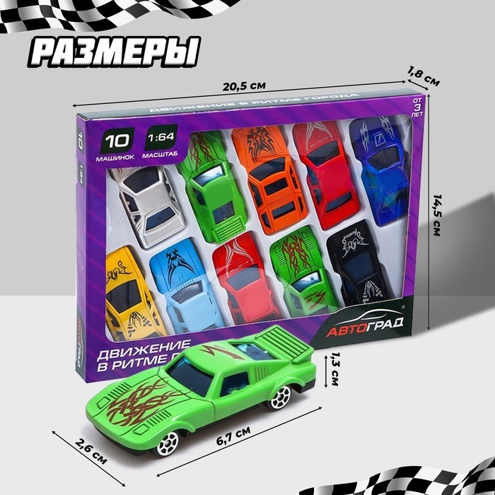 - 10 гоночных автомобилей в комплекте. Машинки небольшого размера подходят для игр на автотреках и парковках.