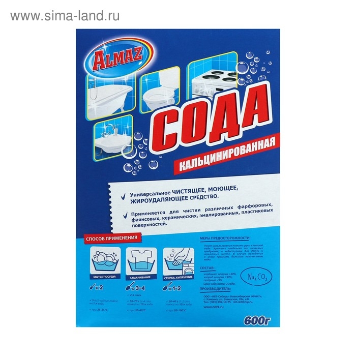 Алмаз Сода кальцинированная универсальное чистящее и моющее средство. Применяется для мытья фарфора, фаянсовой и эмалированной посуды. Эффективно удаляет загрязнения с электрической плиты, духовки, гриля, микроволновой печи, вытяжки и т.д. Незаменим для мытья раковин, душевых кабин, кафеля, ванн и унитазов, удаляя въевшуюся грязь и другие трудновыводимые загрязнения. Не содержит фосфатов, является естественной добавкой для стирального порошка, так же может полностью его заменить, смягчает воду, не раздражает кожу.