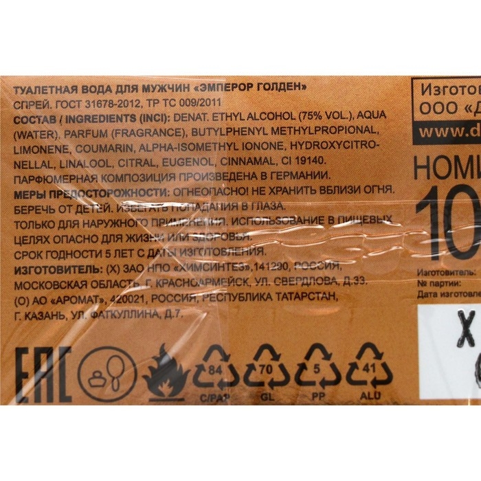 Дерзкая и притягательная туалетная вода Emperor Golden заключена в стильный флакон. Ей отдают предпочтение активные мужчины, которые привыкли добиваться поставленных целей. Композиция демонстрирует брутальность и независимость своего обладателя, его сильную внутреннюю энергию.