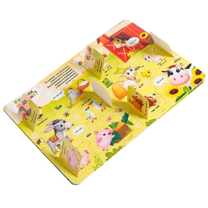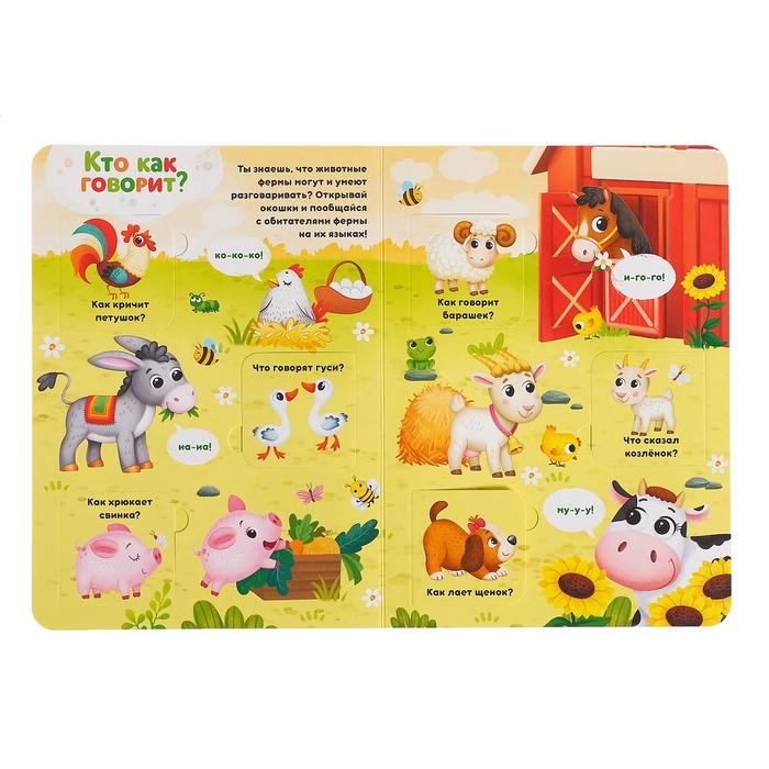 На страницах книги малыш встретит животных, которых можно увидеть на ферме, а ещё — много интересных вопросов о них. Чтобы узнать ответ, достаточно посмотреть, кто спрятался в окошке.