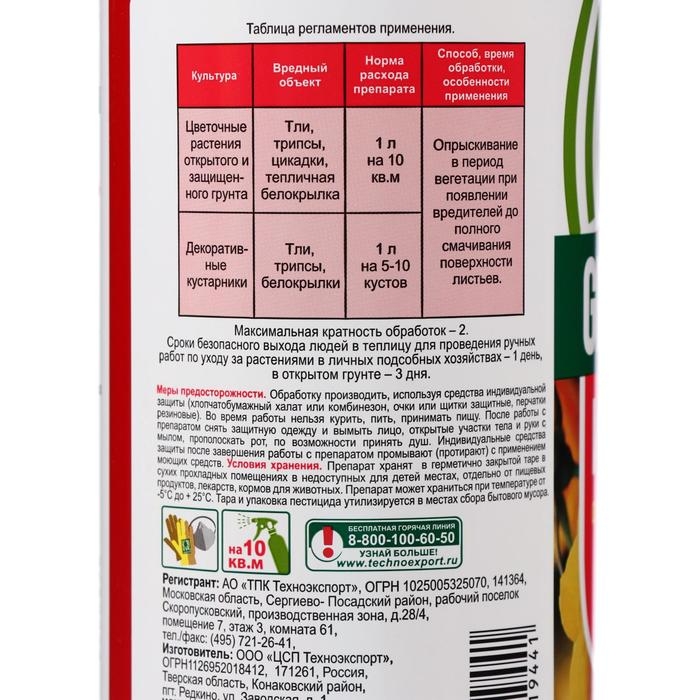Cредством орошают огородные культуры, плодовые кустарники и деревья в период вегетации. Работы проводят в безветренную погоду. Препарат уничтожает личинок и взрослых паразитов, обогащает растения калием. Эффект от применения сохраняется до 14 суток.