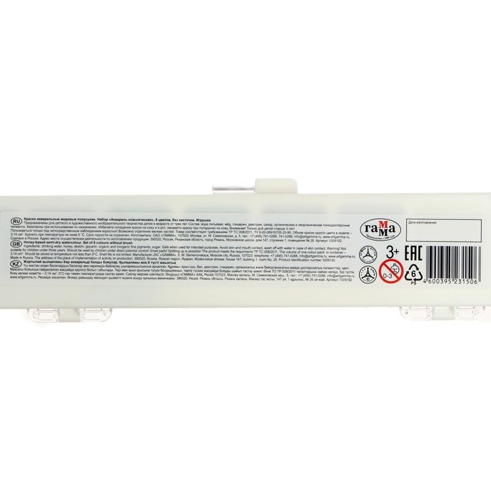 Акварель 8 цветов медовая Гамма "Классическая" без кисти, пластиковая упаковка, европодвес