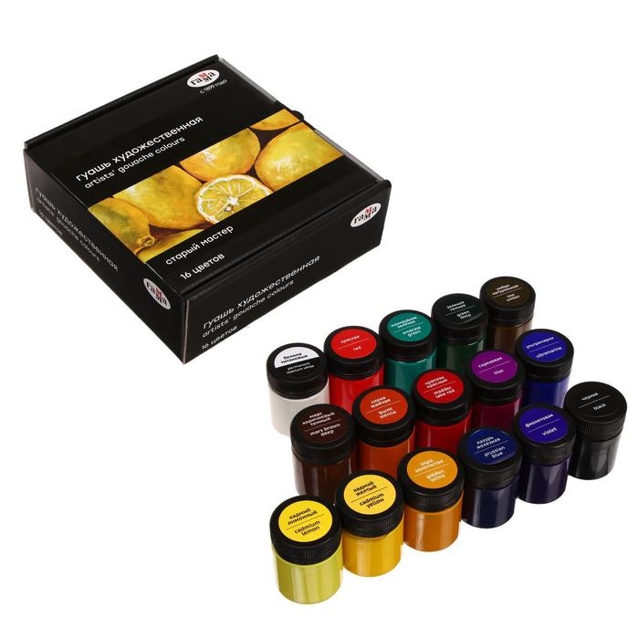 Гуашь художественная "Старый Мастер" - это профессиональные тонкотертые водорастворимые краски. Гуашь имеет уникальную рецептуру, разработанную в собственной исследовательской лаборатории завода совместно с художниками. Краска легко наносится на поверхность, благодаря специальным добавкам сохраняет яркость цвета после высыхания, создает плотный бархатный слой. Краска изготовлена из традиционных художественных пигментов, в том числе пигментов кадмиево-кобальтовой группы. В наборе оптимальная палитра цветов, подобранных профессиональными художниками. Набор 16 цветов, банка 40 мл.