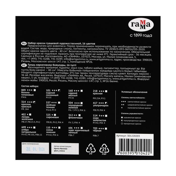 Гуашь художественная набор 16 цветов х 40 мл, Гамма "Старый мастер", 301220203