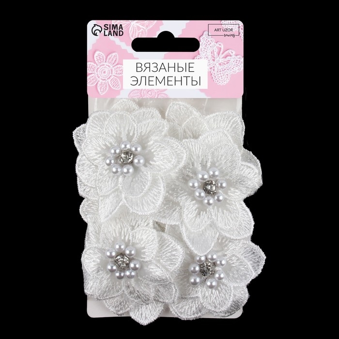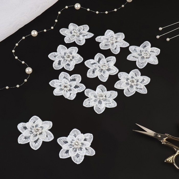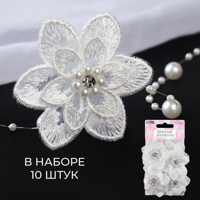 Вязаные элементы с бусинами «Цветы», 5 × 5 см, 10 шт, цвет белый