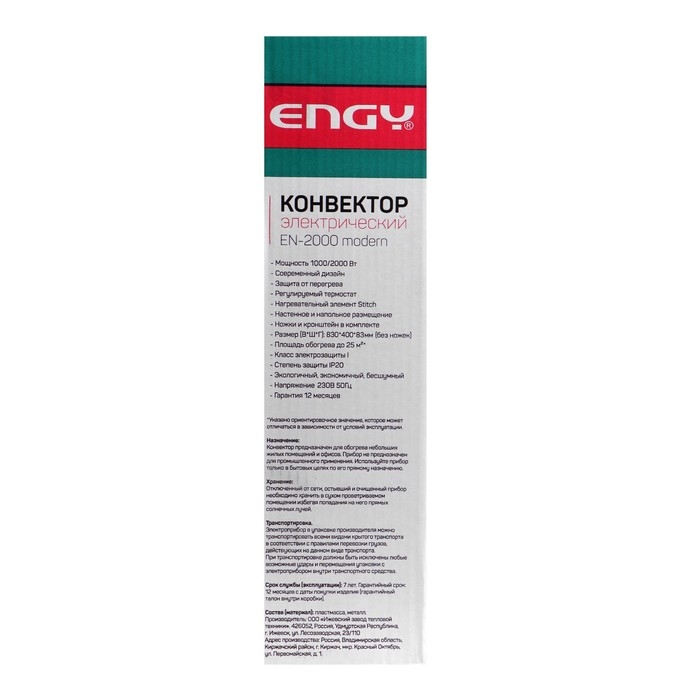 Конвектор электрический Engy EN-2000 Modern, 1000/2000 Вт, настен/напольн, до 25 м²