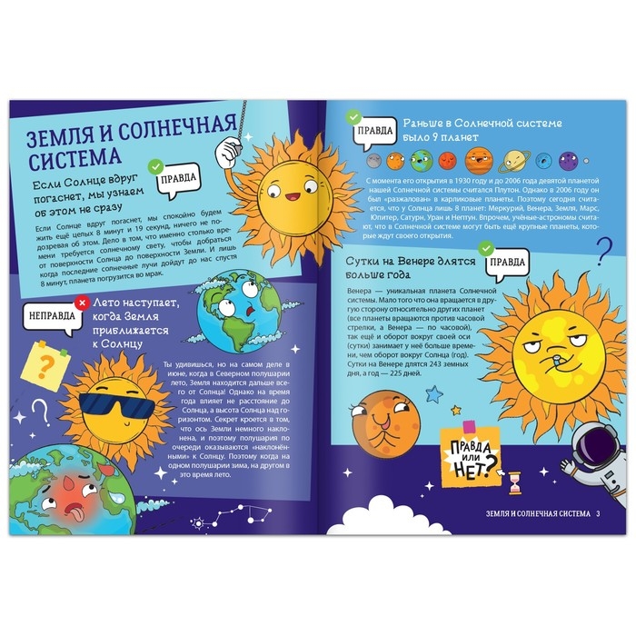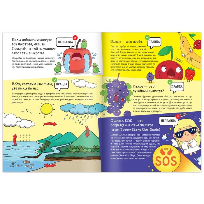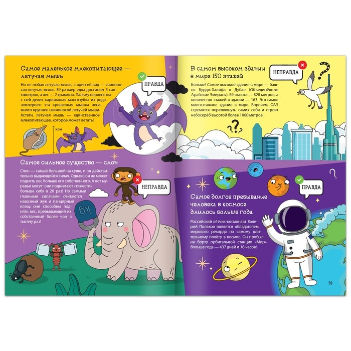 На каждой страничке вас ждут интересные факты. Попробуйте угадать, правда ли это, а затем прочитайте ответ. Например:
