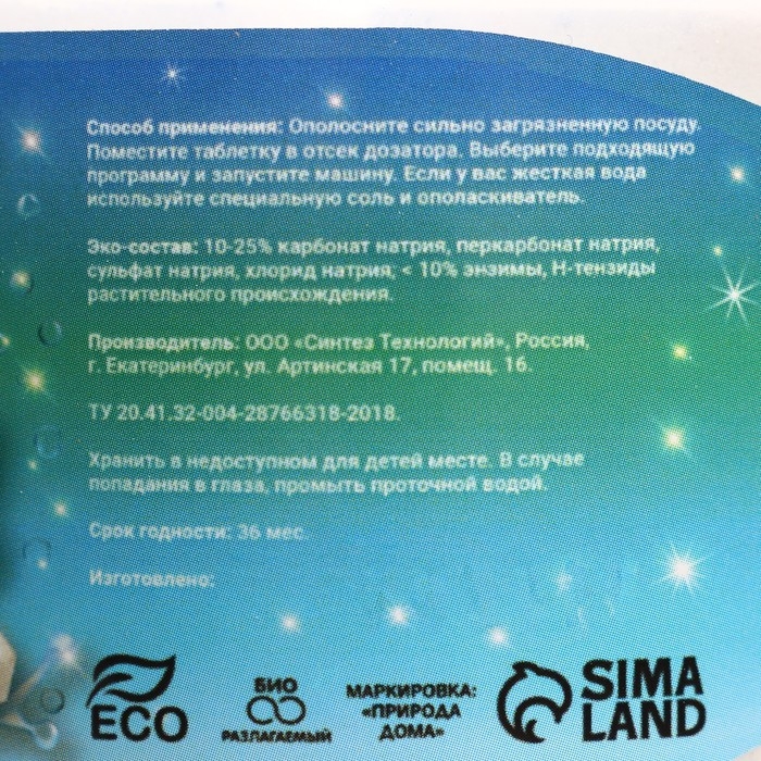 Способ применения: снимите пленку с таблетки. Положите таблетку в предназначенный отсек посудомоечной машины.