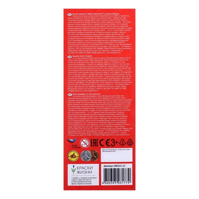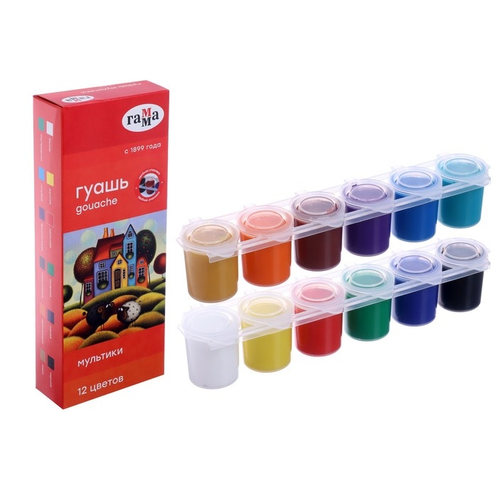 Гуашь 12 цветов по 15 мл Гамма "Мультики", блок-тара, картонная упаковка 100222-12