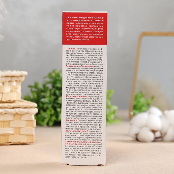 Змеиный яд на основе яда гюрзы, применяется при болезнях суставов с целью снятия боли и воспаления. Оказывает чрезвычайно сильное благотворное действие на суставы и опорно - двигательный аппарат в целом. Хондроитин сульфат - основной структурный компонент хряща и естественный защитник (хондропротектор) его клеток. Обеспечивает механические и эластические свойства суставных поверхностей.