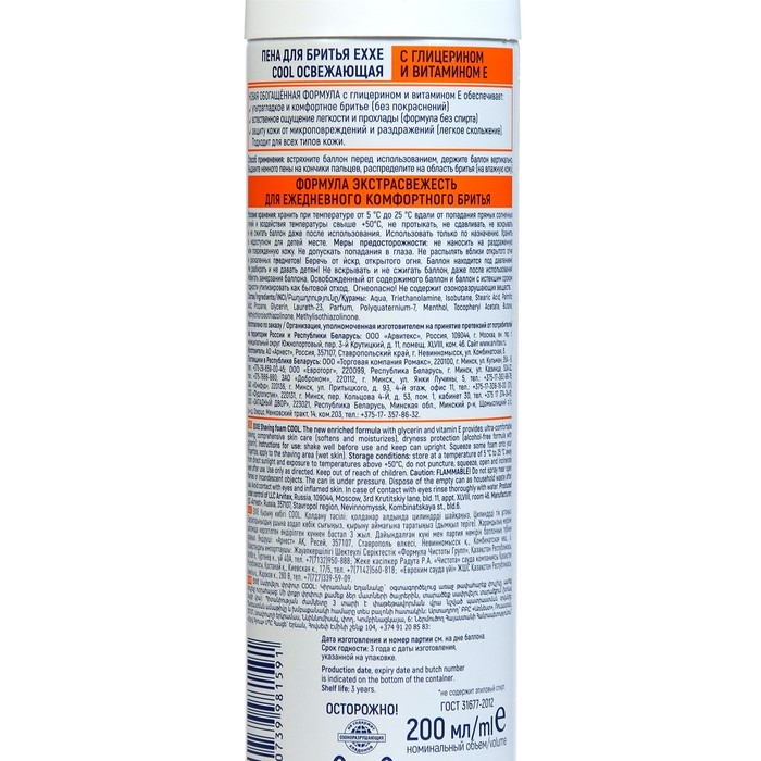 Пена для бритья Exxe Cool. Новая обогащенная формула с глицерином и витамином E обеспечивает ультрагладкое и комфортное бритье без покраснений, естественное ощущение легкости и прохлады формула без спирта с аллантоином, защиту кожи от микроповреждений и раздражений смягчает и увлажняет. Подходит для всех типов кожи.