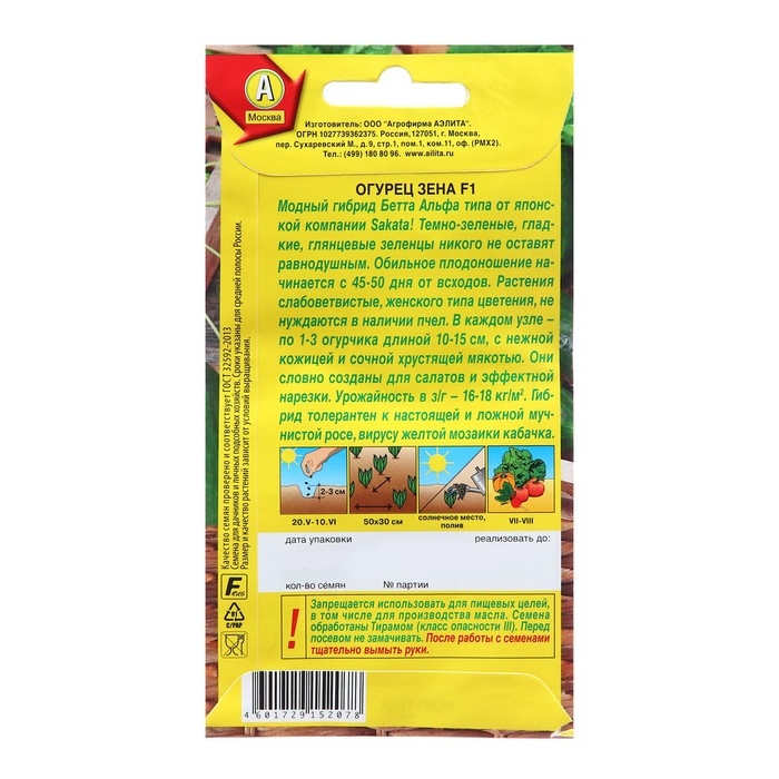 Модный гибрид Бетта Альфа типа от японской компании Sakata! Темно-зеленые, гладкие, глянцевые зеленцы никого не оставят равнодушным. Обильное плодоношение начинается с 45-50 дня от всходов. Растения слабоветвистые, женского типа цветения, не нуждаются в наличии пчел. В каждом узле – по 1-3 огурчика длиной 10-15 см, с нежной кожицей и сочной хрустящей мякотью. Они словно созданы для салатов и эффектной нарезки. Урожайность в з/г – 16-18 кг/м2. Гибрид толерантен к настоящей и ложной мучнистой росе, вирусу желтой мозаики кабачка.Запрещается использовать для пищевых целей, в том числе для производства масла. Семена обработаны Тирамом (класс опасности III). Перед посевом не замачивать. После работы с семенами тщательно вымыть руки.