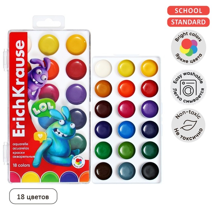 Акварель 18 цветов, ErichKrause Jolly Friends, без кисти, пластиковая коробка, еврподвес