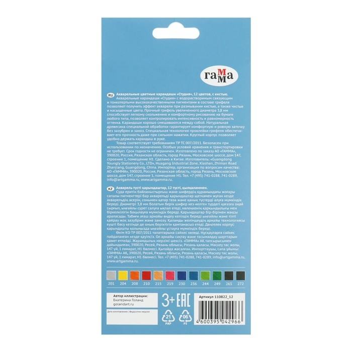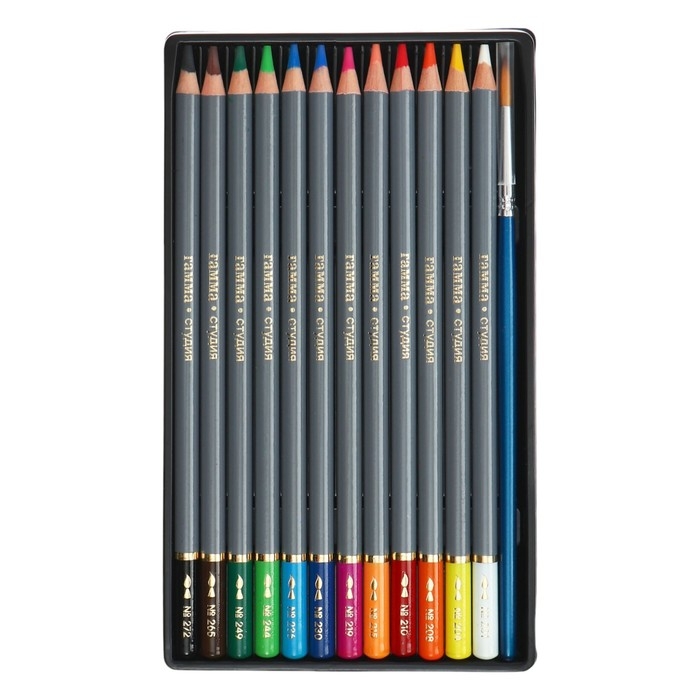Акварельные художественные карандаши ГАММА серии «Студия» отличаются мягким нанесением на бумагу. В наборе 72 ярких и насыщенных цвета. Диаметр грифеля – 3,8 мм. Карандаши легко растушёвываются, позволяют прорисовывать детали и достигать плавных акварельных переходов при размывании кистью. благодаря высококачественной технологии двойного проклеивания грифель не ломается при падении. Круглый корпус карандаша диаметром 7,8 мм изготовлен из липы специальной обработки, и его легко затачивать точилкой, ножом или наждаком. В комплекте – кисть «ГАММА» № 4 из синтетического волоса. Представлены в удобной упаковке из 100% перерабатываемого материала в креативном дизайне.
