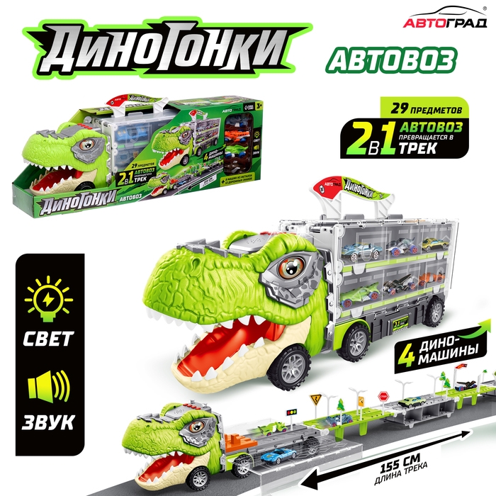 Автовоз-трек «Диногонки» — это уникальный игровой набор, который включает в себя 12 металлических машинок и транспортный трек, превращающийся в захватывающую гоночную трассу. Автовоз оснащён световыми и звуковыми эффектами, добавляющими ещё больше реалистичности и веселья в игру. Набор станет идеальным подарком для юных любителей автомобилей и активных игр.