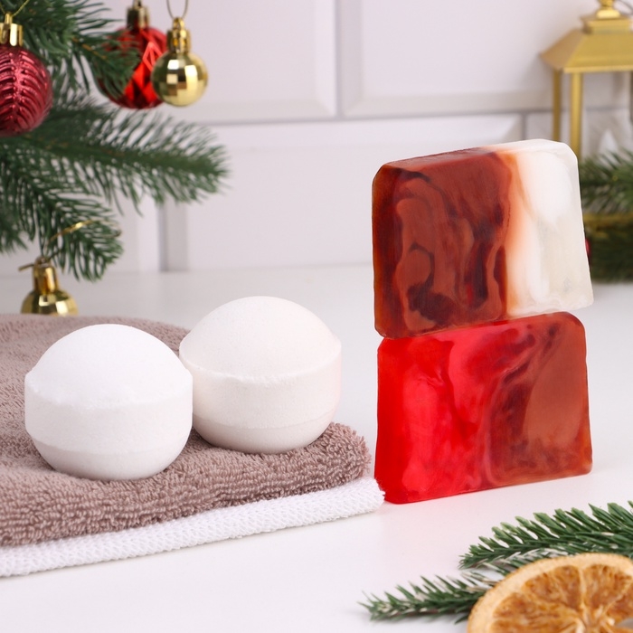 Новый год. Набор 2 бомбочки "Ваниль, Хвойный лес" и 2 мыла "Глинтвейн, Горячий шоколад"