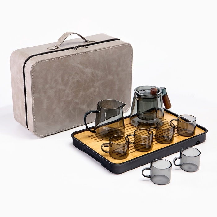 Набор для чайной церемонии 9 предметов, на 6 персон - идеальный подарок для ценителей изысканного вкуса и традиций. Включает в себя все необходимое для проведения традиционной церемонии, которая позволит вам насладиться чаем, а также погрузиться в атмосферу спокойствия и релаксации. В набор входят девять предметов, которые помогут вам создать уютную обстановку и провести чайную церемонию на высшем уровне: Заварочный чайник — это емкость, в которой заваривается чай. В нем чай настаивается и приобретает свой вкус и аромат. Чахай (сливник) - это сосуд, который используется для слива настоявшегося чая из чайника в чашки. Он помогает равномерно распределить чай по чашкам и избежать перелива. Чабань (чайная доска или поднос) - это низкий столик с поддоном для стекания воды и чая. На подносе также размещаются все предметы для церемонии. Чабань изготовлена из бамбука и пластика. 6 чашек предназначены для каждого участника церемонии. Они имеют удобную форму и размер, чтобы комфортно наслаждаться напитком. Все предметы набора упакованы в компактную сумку-чемодан, которая обеспечивает удобство хранения и транспортировки. Сумка изготовлена из прочного материала, который защищает набор от повреждений и загрязнений. Имеет удобную ручку и застежку-молнию.