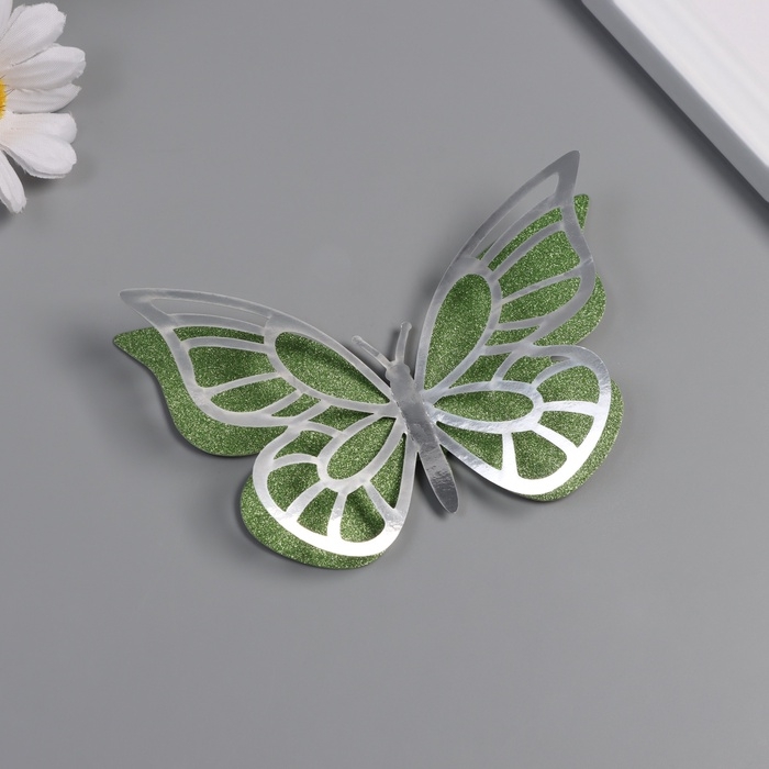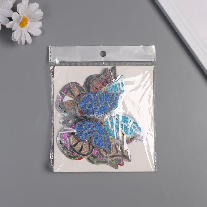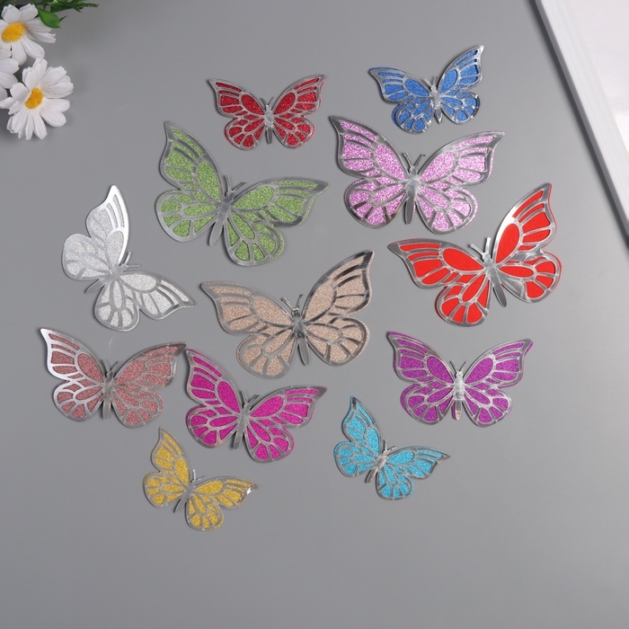 Наклейка бумага, пластик "Бабочки, цветной глиттер" серебро набор 12 шт 12 см, 10 см 8 см
