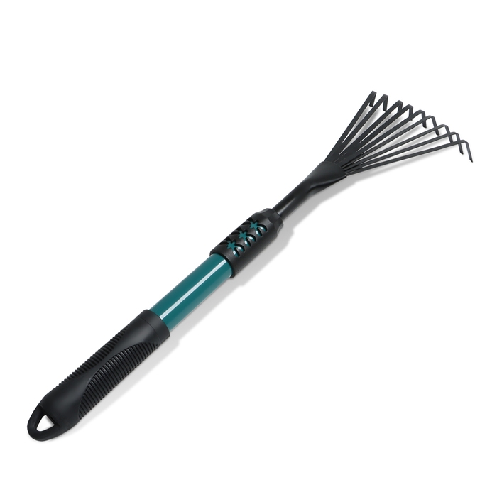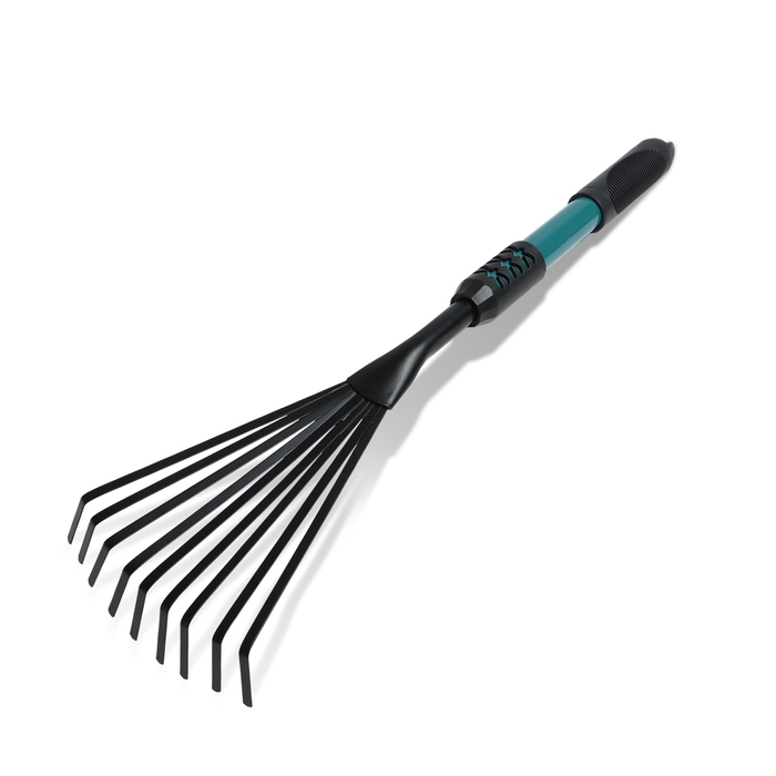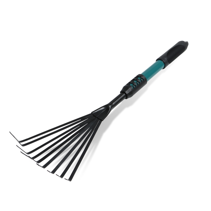 Грабли малые, веерные, пластинчатые, 9 зубцов, длина 52 см, металл, металлическая рукоять с резиновой ручкой, Greengo
