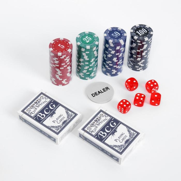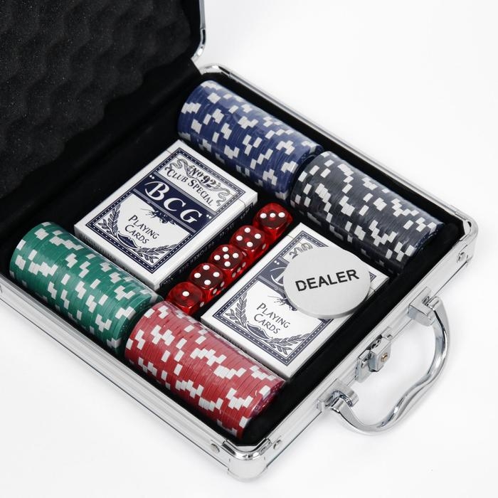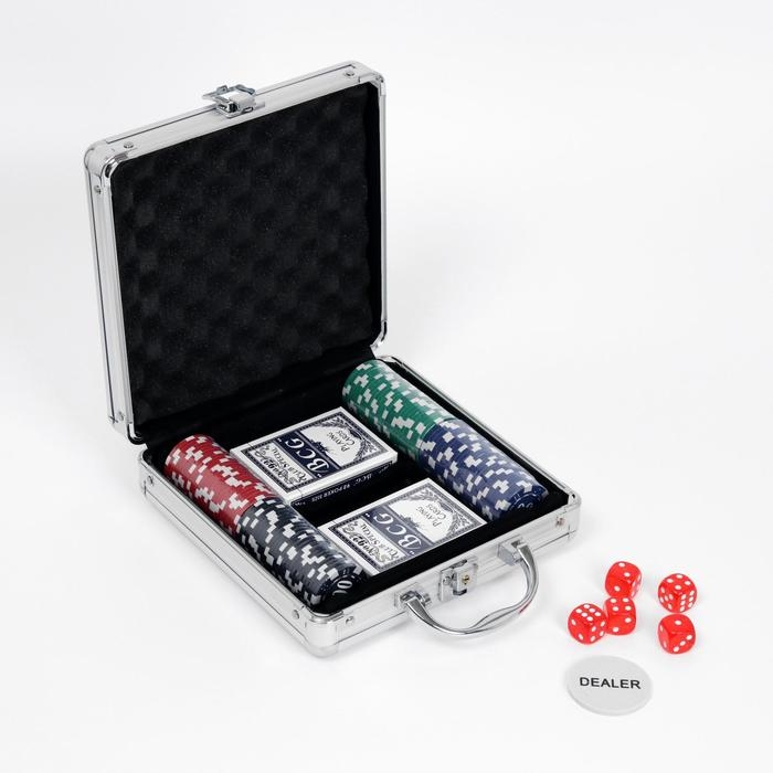 Покер в металлическом кейсе (2 колоды, фишки 100 шт с номиналом, 5 кубиков), 20 х 20 см