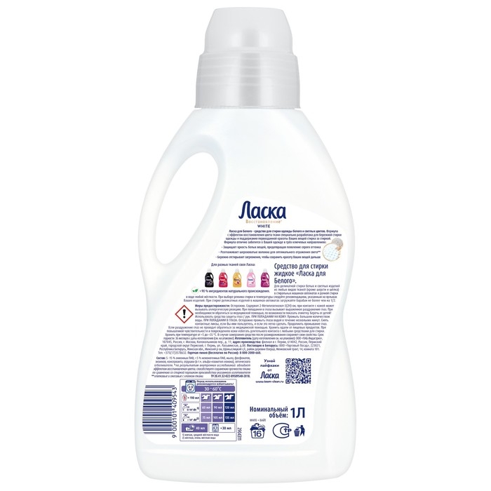 Жидкий порошок Ласка Восстановление WHITE для белого эффективно и бережно отстирывает загрязнения на одежде и белье. Формула содержит специальный оптический отбеливатель, благодаря чему средство Ласка восстанавливает и сохраняет белизну вещей, предотвращая появление серого оттенка. Активные компоненты способствуют уменьшению количества катышков на ткани и сохраняют прочность волокон ткани. В результате регулярного использования средства для стирки Ласка поверхность ткани становится более гладкой.