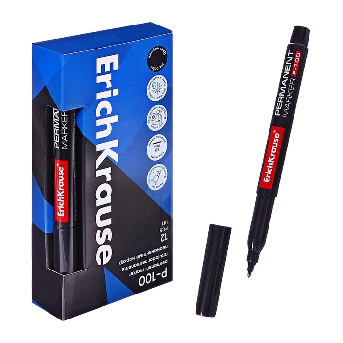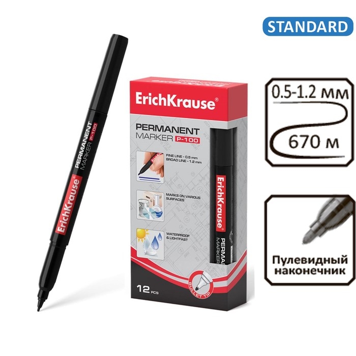 Маркер перманентный ErichKrause P-100, 0.5-1.2 мм, чернила на спиртовой основе светостойкие, водостойкие без ксилола, чёрный