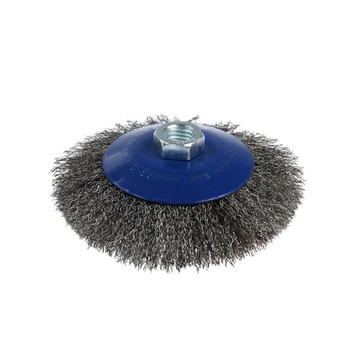 Металлическая щётка типа «тарелка» ТУНДРА предназначена для зачистки, шлифования, полирования, матирования изделий из различных материалов, удаления ржавчины и грязи с металлических поверхностей в щадящем режиме. Применяется совместно с угловой шлифовальной машиной, тип крепления - М14.