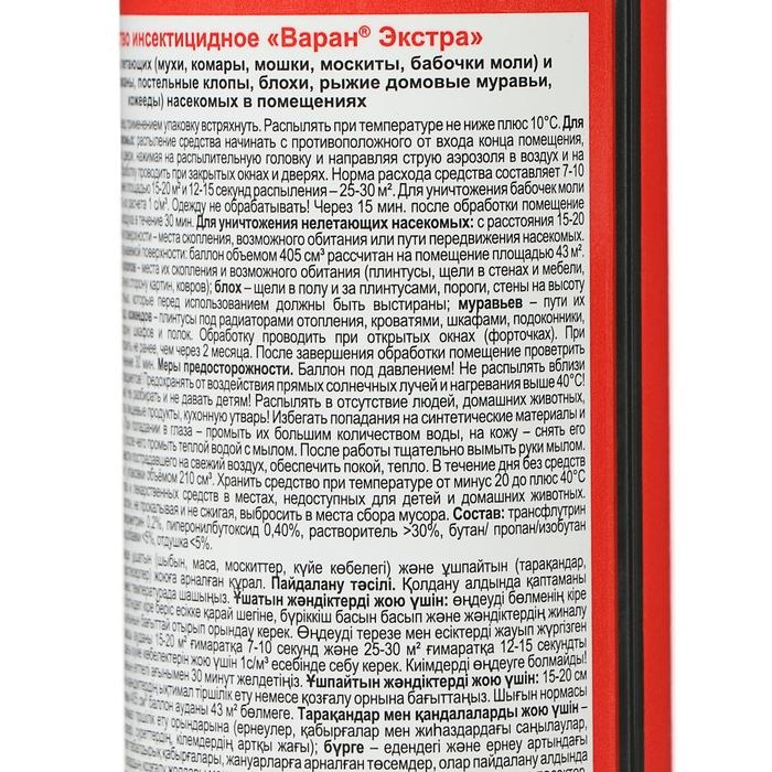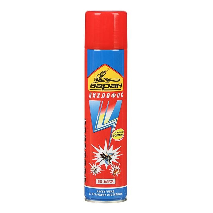 На природе и дома многие люди сталкиваются с клещами, клопами, москитами и другими опасными насекомыми, которые способны причинить массу вреда. Они переносят инфекцию, пьют вашу кровь и просто раздражают своим внешним видом. Вы устали бороться с ними? Дихлофос от торговой марки «Варан» — высокоэффективное средство для уничтожения ползающих (тараканов, муравьёв, клопов и т. д.), а также летающих насекомых (мух, москитов, комаров). Способ применения: перед использованием хорошо взболтайте, распылите. Состав: тетраметрин 0,12 %, циперметрин 0,2 %, пиперонилбутоксид 0,4 %, отдушка менее 5 %, функциональные добавки менее 5 %, смесь бутан / пропан / изобутан более 30 %, растворители более 30 %. Способ применения: перед использованием хорошо взболтайте, распылите.