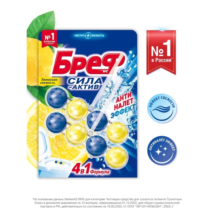 Блок для чистки и свежести унитаза 4 в 1, Bref Сила актив "Лимонная свежесть", 50 г